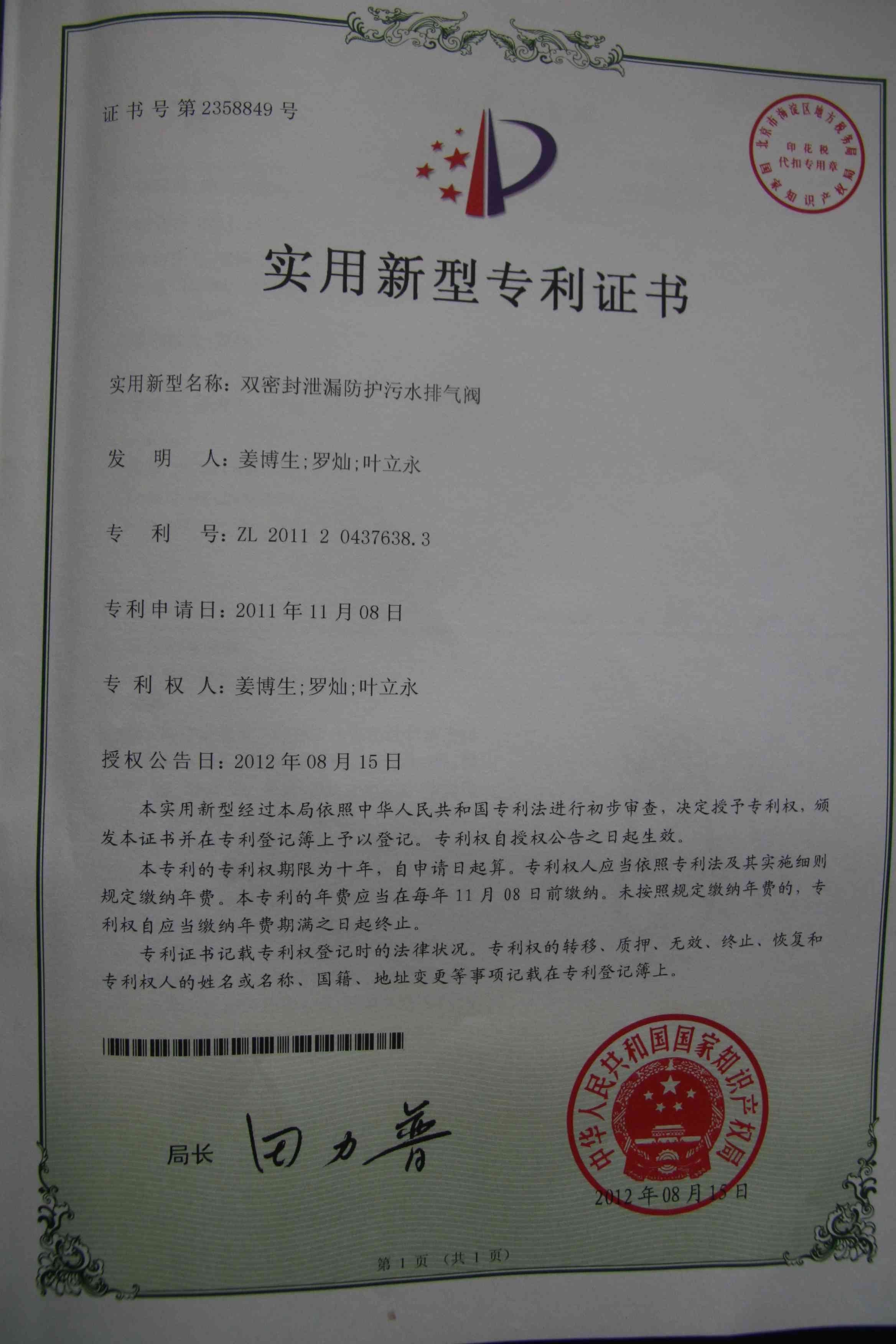 《雙密封泄漏防護污水排氣閥》獲國家級實用新型專利