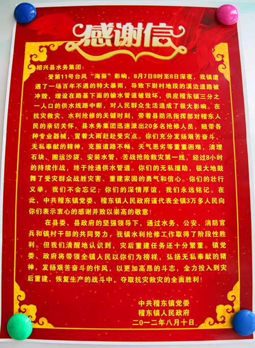 月17日,中共稽東鎮黨委、稽東鎮人民政府專程為集團送來感謝信和錦旗,衷心感謝集團在第11號臺風“海葵”期間,發揚艱苦奮斗、無私奉獻精神,第一時間成功搶修被毀壞的輸水總管,保障了該鎮人民群眾的飲水安全。